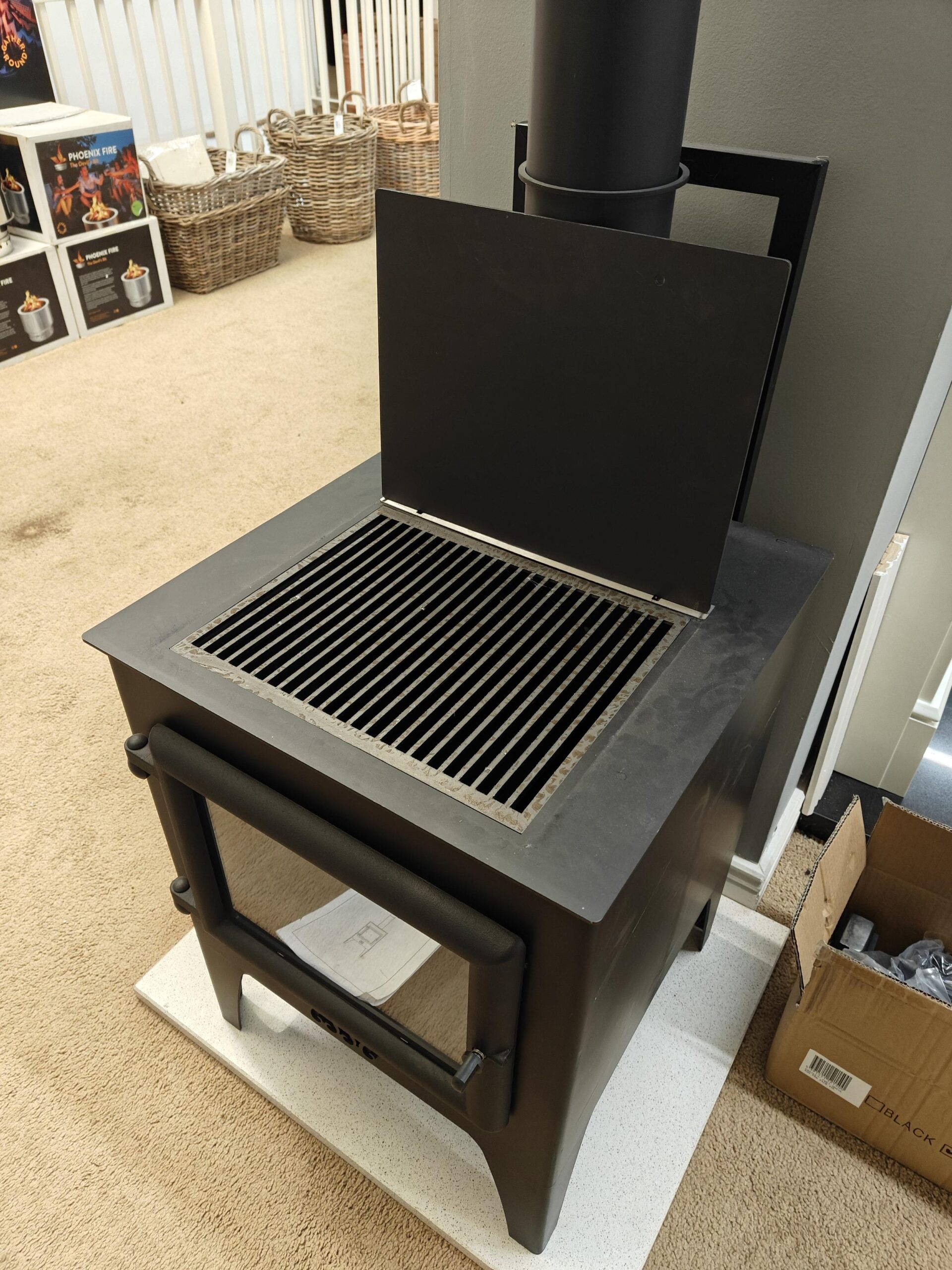 Garden Stove is an outdoor stove with some cooking capability. It comes with wheels to allow it to be easily repositioned or moved after use to protect it from the weather.